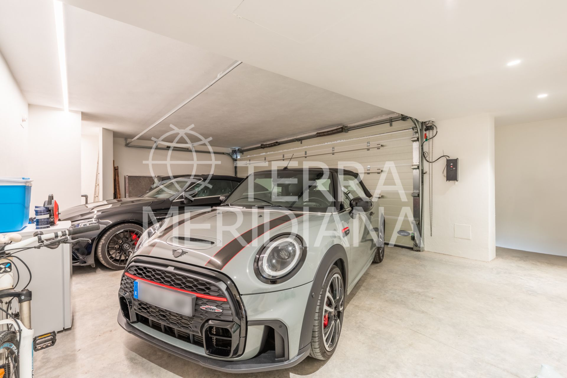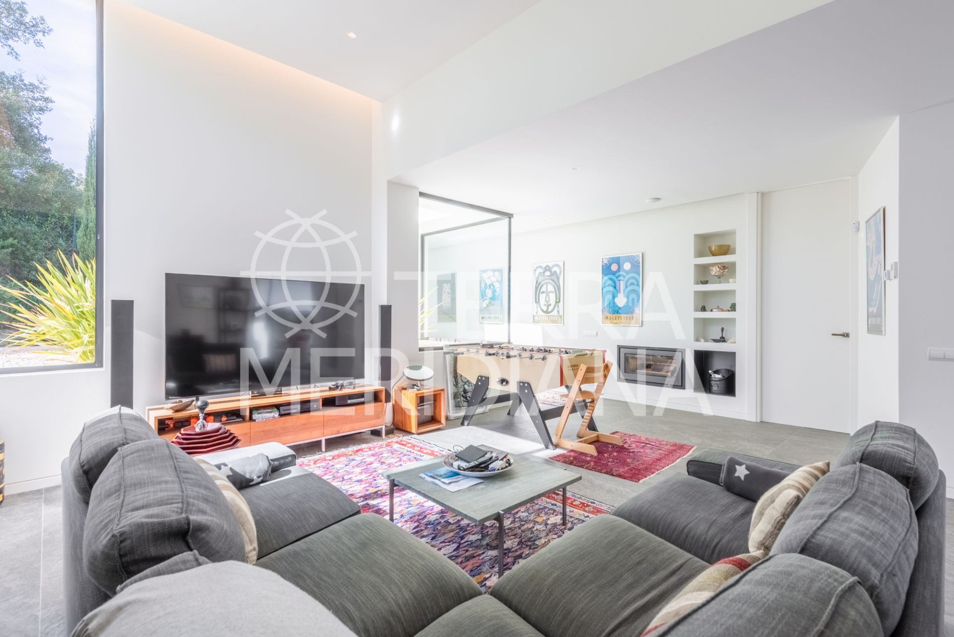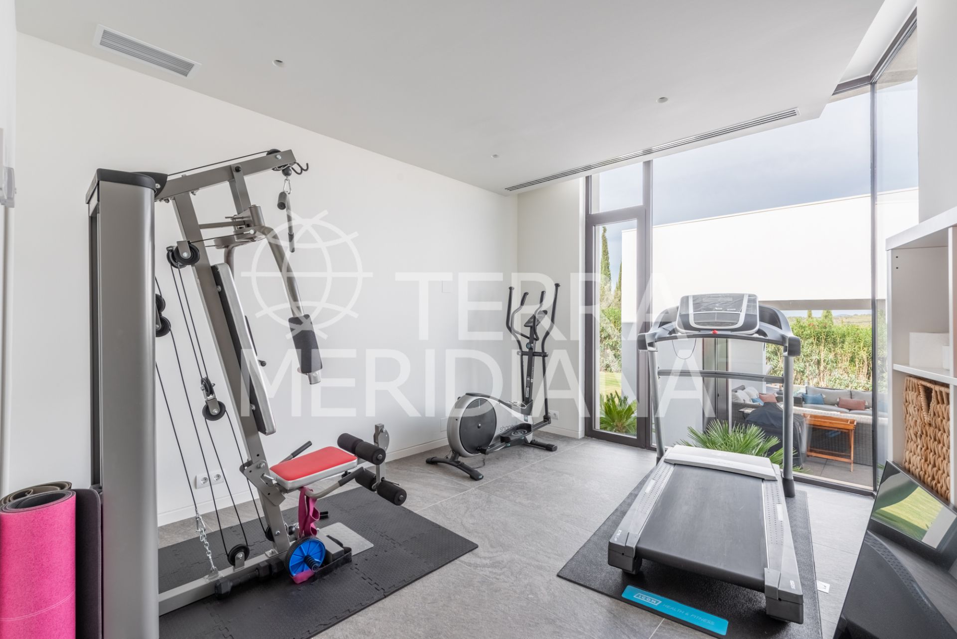 Multilevel contemporary style villa in a quiet location at the end of a cul-de-sac with views to the Almenara Golf Course. The spacious accommodation comprises of an entrance hall, study and master bedroom ensuite with dressing room on the top floor; TV room with fireplace, gymnasium, snug, 2 bedroom suites, guest toilet, living room with fireplace, dining room and fully fitted kitchen with access to the terrace, garden and pool area on the ground floor; 2 further bedrooms sharing 1 shower room, laundry room, storeroom, boiler room and double garage on the lower ground floor. Includes hot/cold air conditioning, underfloor heating, aluminium double glazing and solar panels.