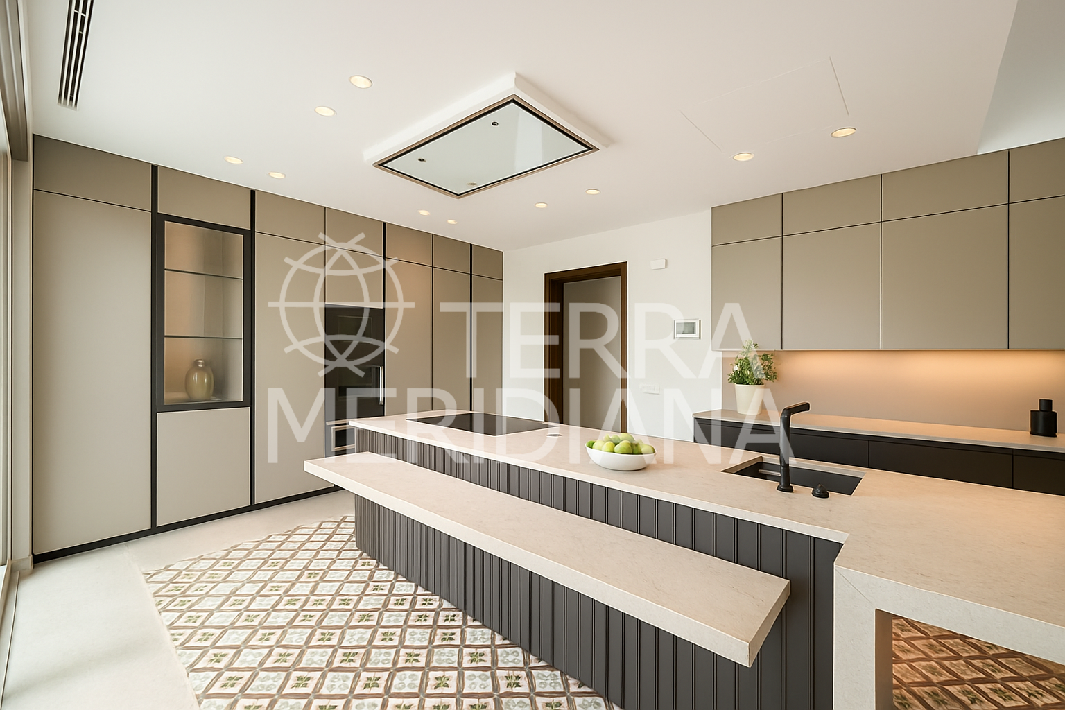The residence offers five spacious bedroom suites, each designed for maximum privacy and tranquillity. At the heart of the home, the bright and expansive living room opens directly onto landscaped gardens and terraces, seamlessly connecting indoor and outdoor living. A separate kitchen and dining area, fitted with top-of-the-line appliances and refined finishes, provides the perfect setting for family living or entertaining.