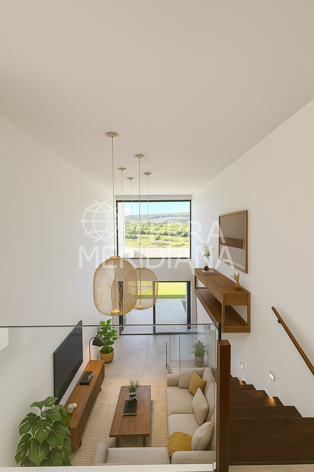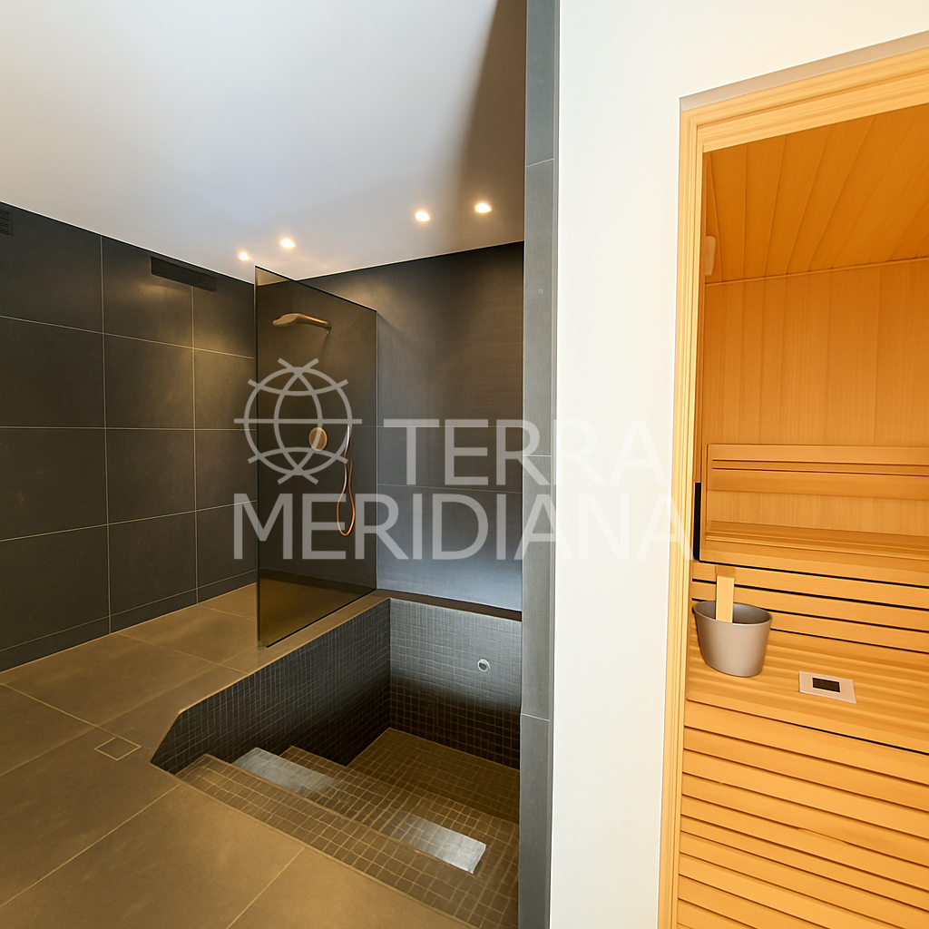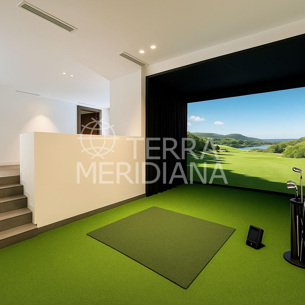 The lower level is dedicated to leisure and wellness, featuring pre-installation for a state-of-the-art indoor golf training studio with Trackman technology, as well as a sauna, cold plunge pool, laundry room, and generous storage areas. Practical additions include a garage for 2–3 cars, technical room, and further utility spaces.