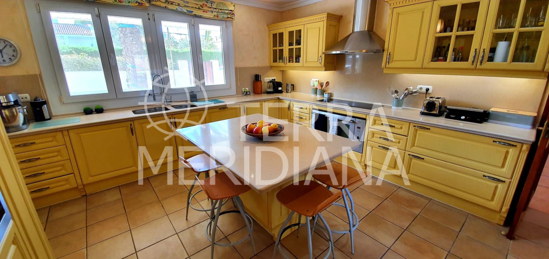 Designed for comfort and relaxed living, the villa features two large living rooms, a fully equipped kitchen with adjoining dining area, and air conditioning throughout. The accommodation comprises seven spacious bedrooms, six bathrooms, and a playroom/guest room with a sofa bed, making it perfectly suited for large families or those who love to host guests.