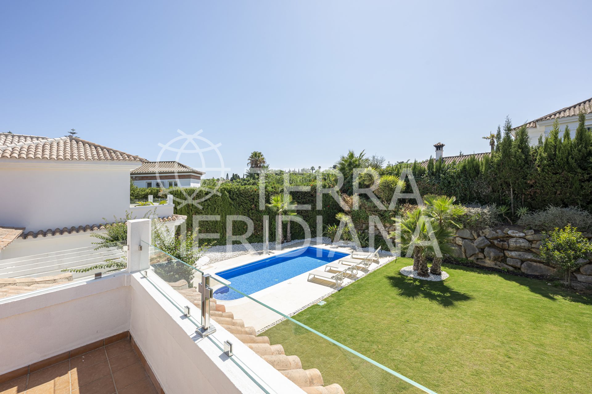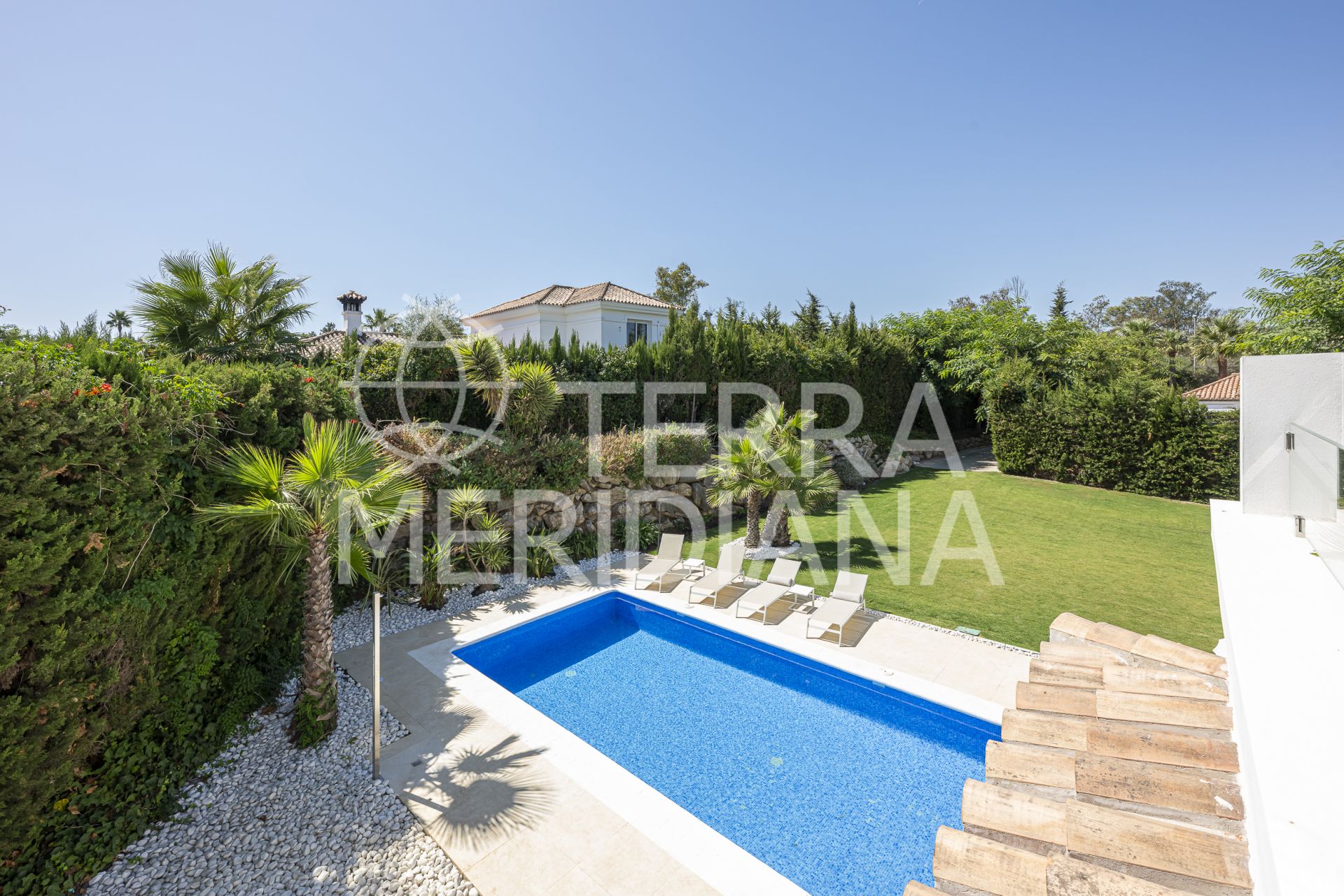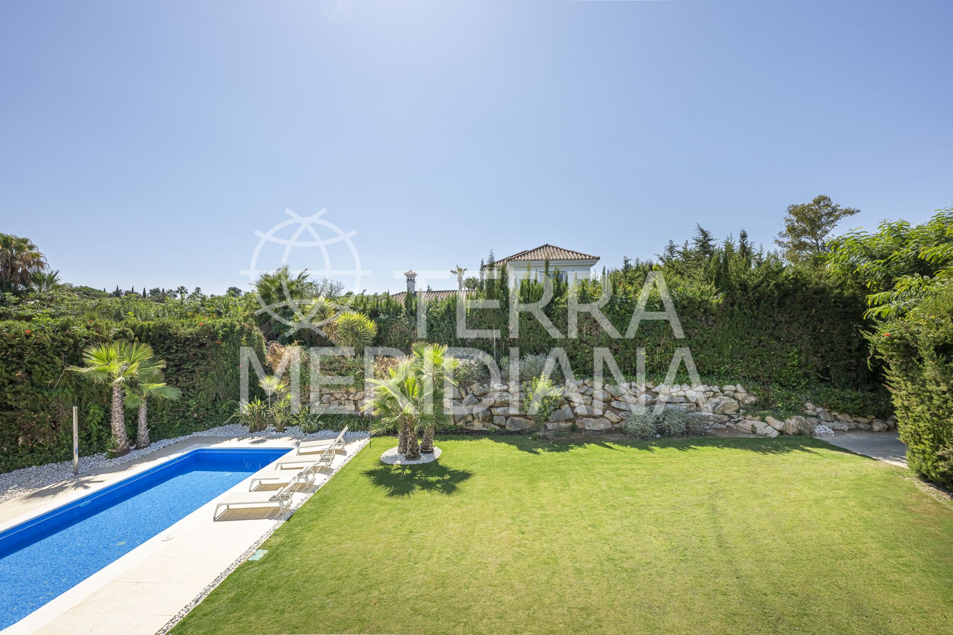 Highlights • Five ensuite bedrooms, including two master suites • Light-filled open-plan living area • Expansive terraces on both sides of the villa • Swimming pool & private gardens • Air conditioning & central heating • Fireplace • Automatic irrigation system • Conveniently close to schools, golf courses, and polo fields