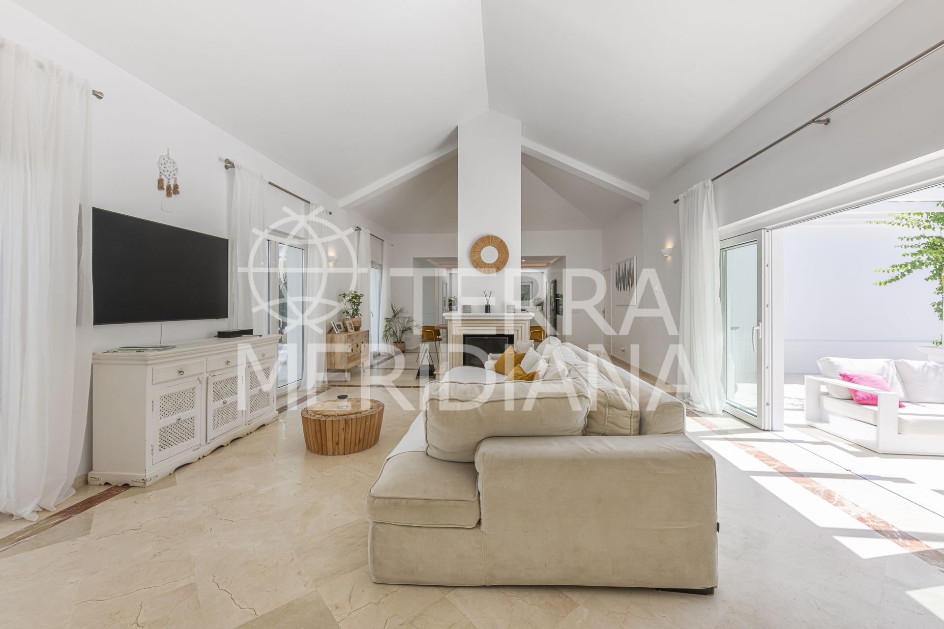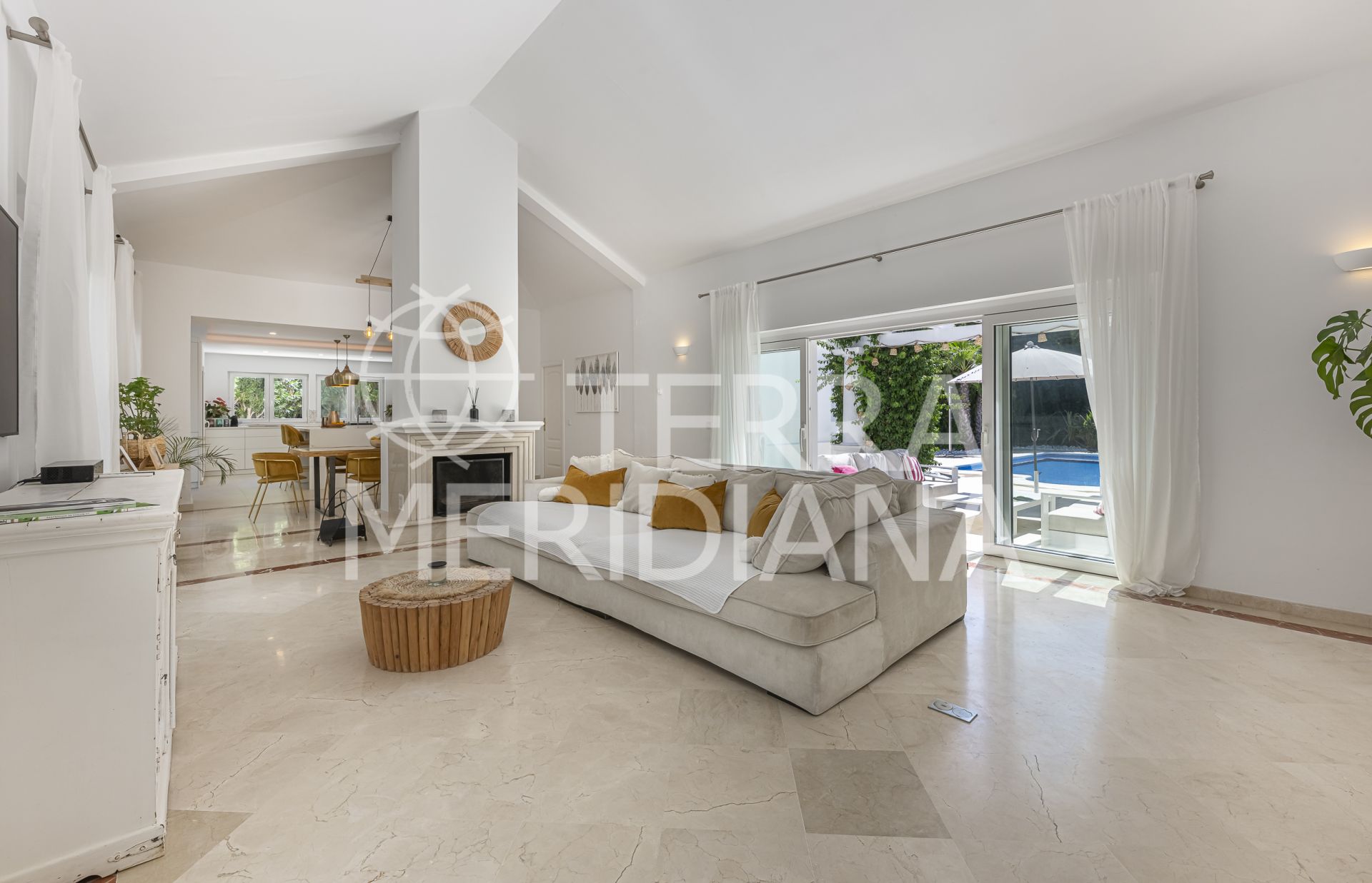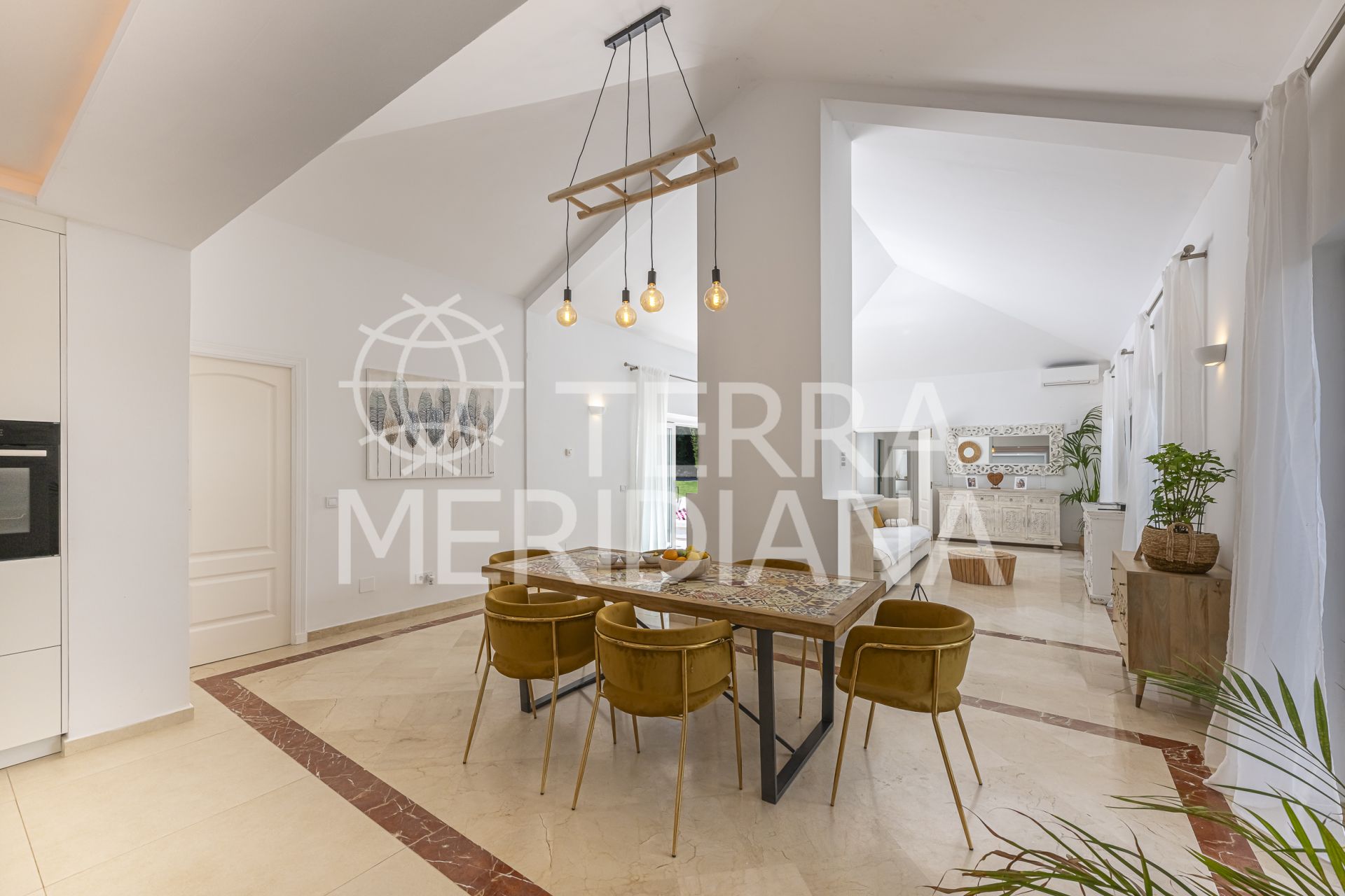The spacious, open-concept living, dining, and kitchen area is filled with natural light and opens onto large terraces on either side of the house, providing ideal spaces for relaxing or hosting guests.