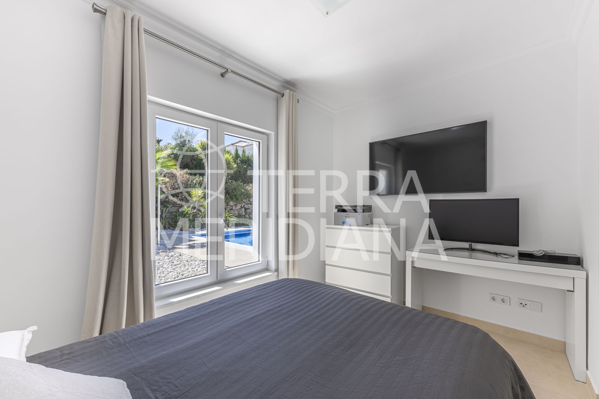 Finished to a high standard, the villa combines sleek modern touches with practical design, ensuring it works equally well as a family home or a peaceful retreat. Outside, landscaped gardens and a private pool create a haven of privacy and relaxation.