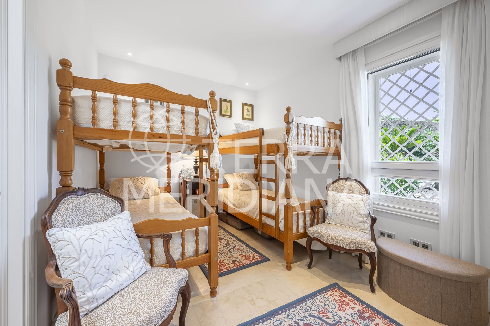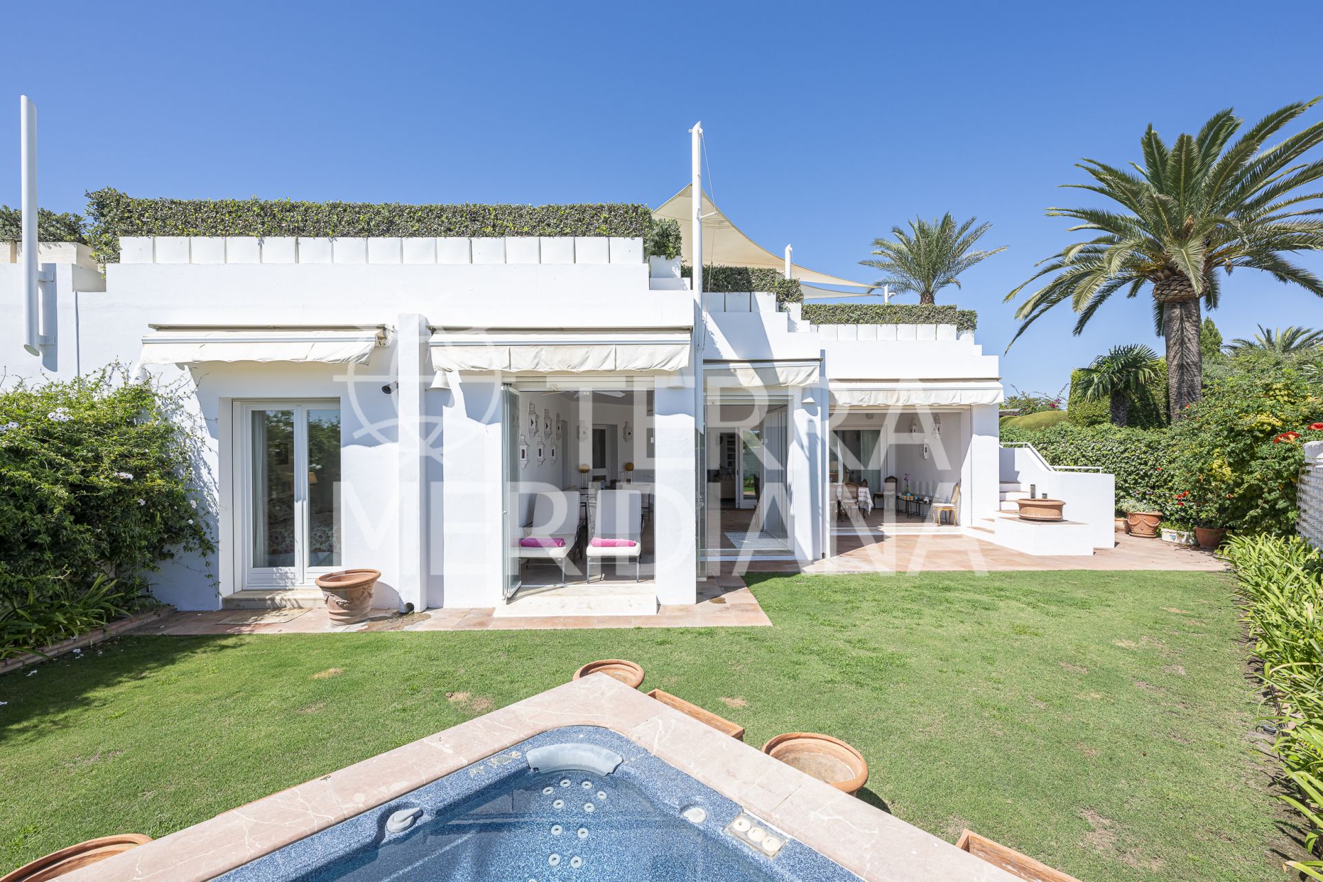 One of the very few frontline beach properties in Sotogrande, located in the prestigious gated “Bungalows” community, next to the Real Club de Golf de Sotogrande and just meters from the beach.